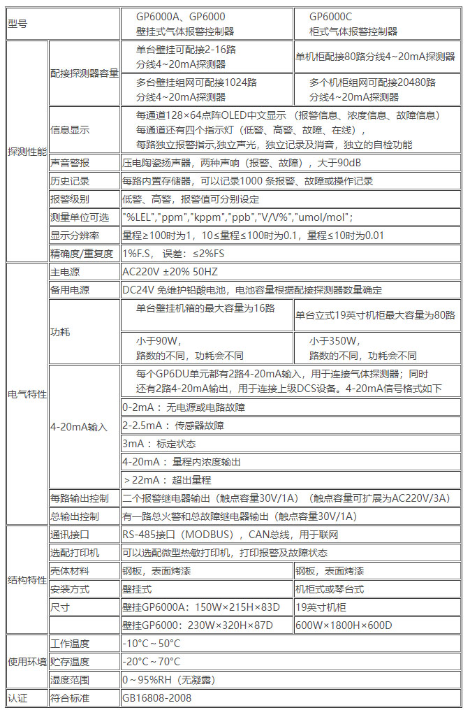 四.GP6000氣體報(bào)警控制器技術(shù)參數(shù)