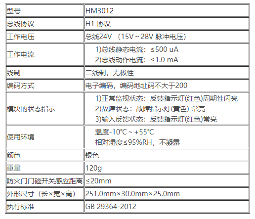 三、HM3012一體式常閉防火門監控模塊技術參數