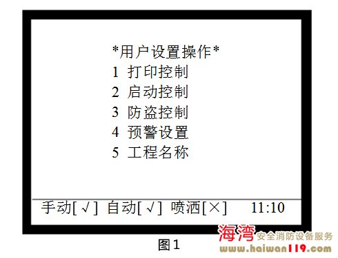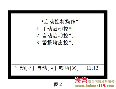 啟動控制設置 在圖1所示界面下,按2進入“啟動控制”界面,調出啟動控制操作菜單,如圖2所示,包含手動啟動控制、自動啟動控制、警報輸出控制的設置,可通過按下其對應的數字鍵進行相關的設置