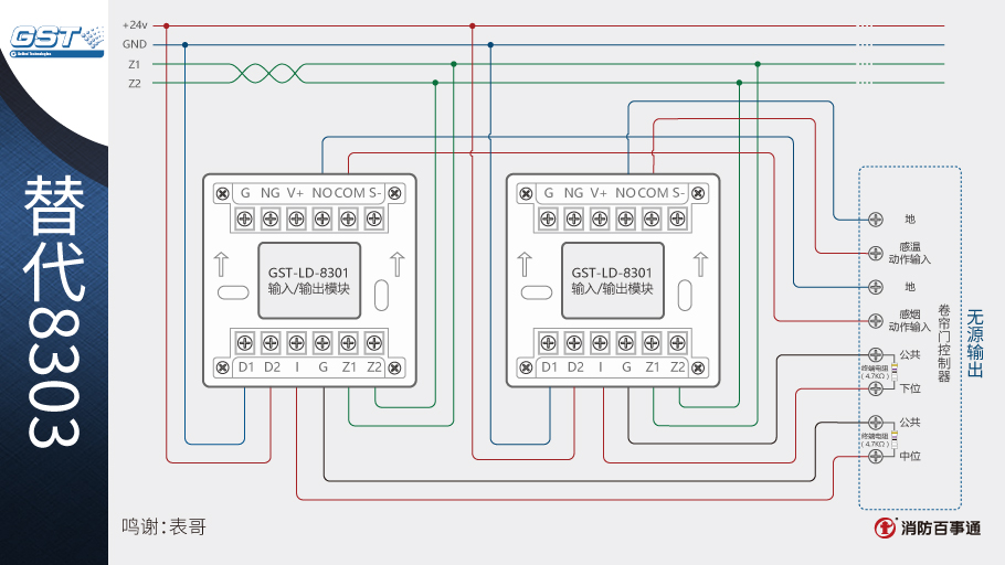 1、海灣8301模塊可以替代海灣的8303模塊控制防火卷簾,兩個8301模塊相當于1個8303模塊。